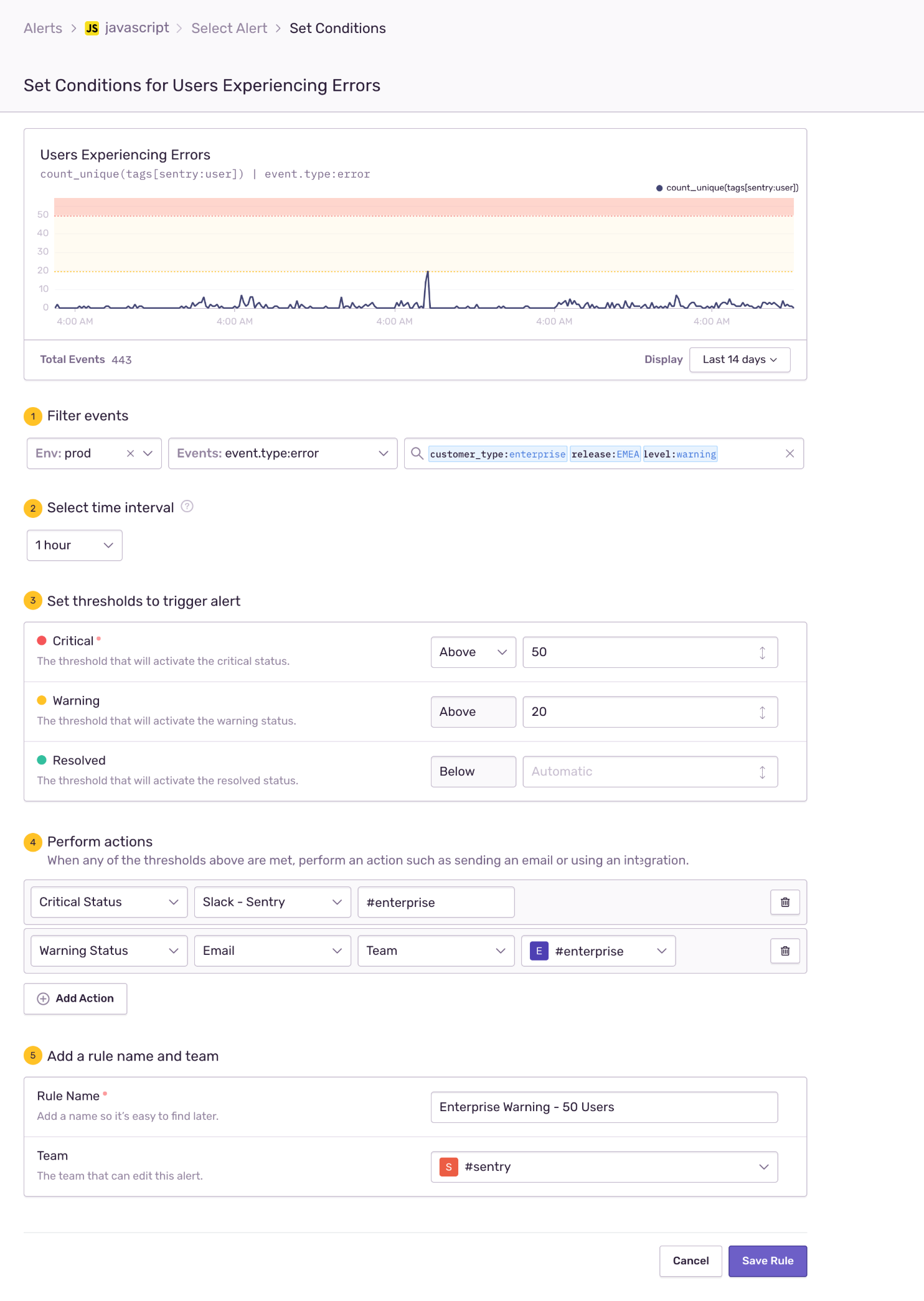 Metric Alerts: The following rule will trigger a Slack message if more than 50 enterprise end-users in one hour are impacted by warning level errors (from multiple issues) originating from my EMEA releases in my prod environment: