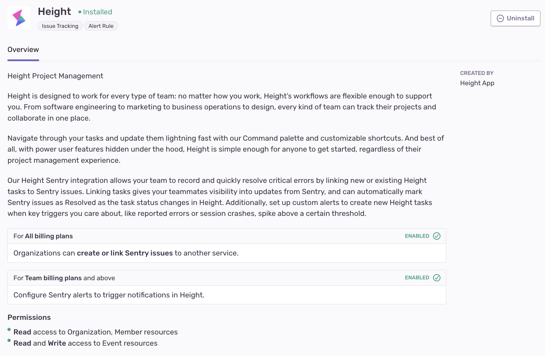 Learn more about Sentry's Height integration and how you can effortlessly create new Height tasks from Sentry and link Sentry issues to existing Height tasks.