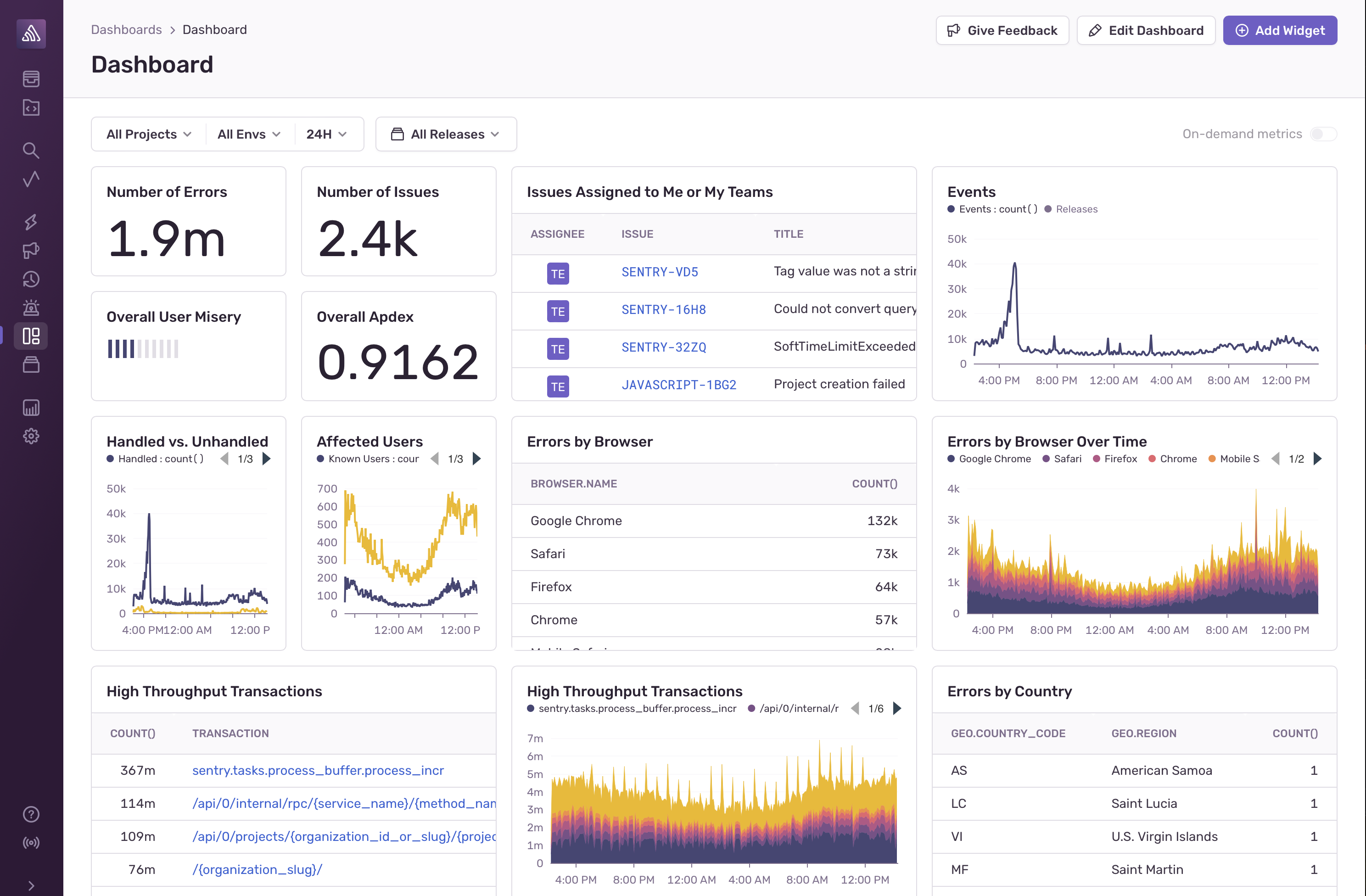 Sentry's Dashboards provide a single view of your application's health, including the ability to navigate issues and performance across multiple projects.