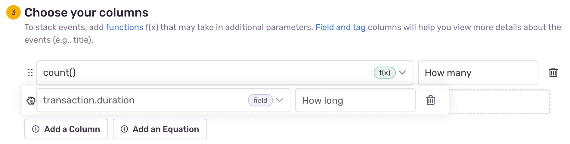 By default, the first column is already configured for you, but you can update it. To add more columns, which stacks events, add functions (f(x)) that can take in parameters. Field and tag columns will help you view more details about the events (for example, title to see the description of an issue or users to see how many users it's affecting).