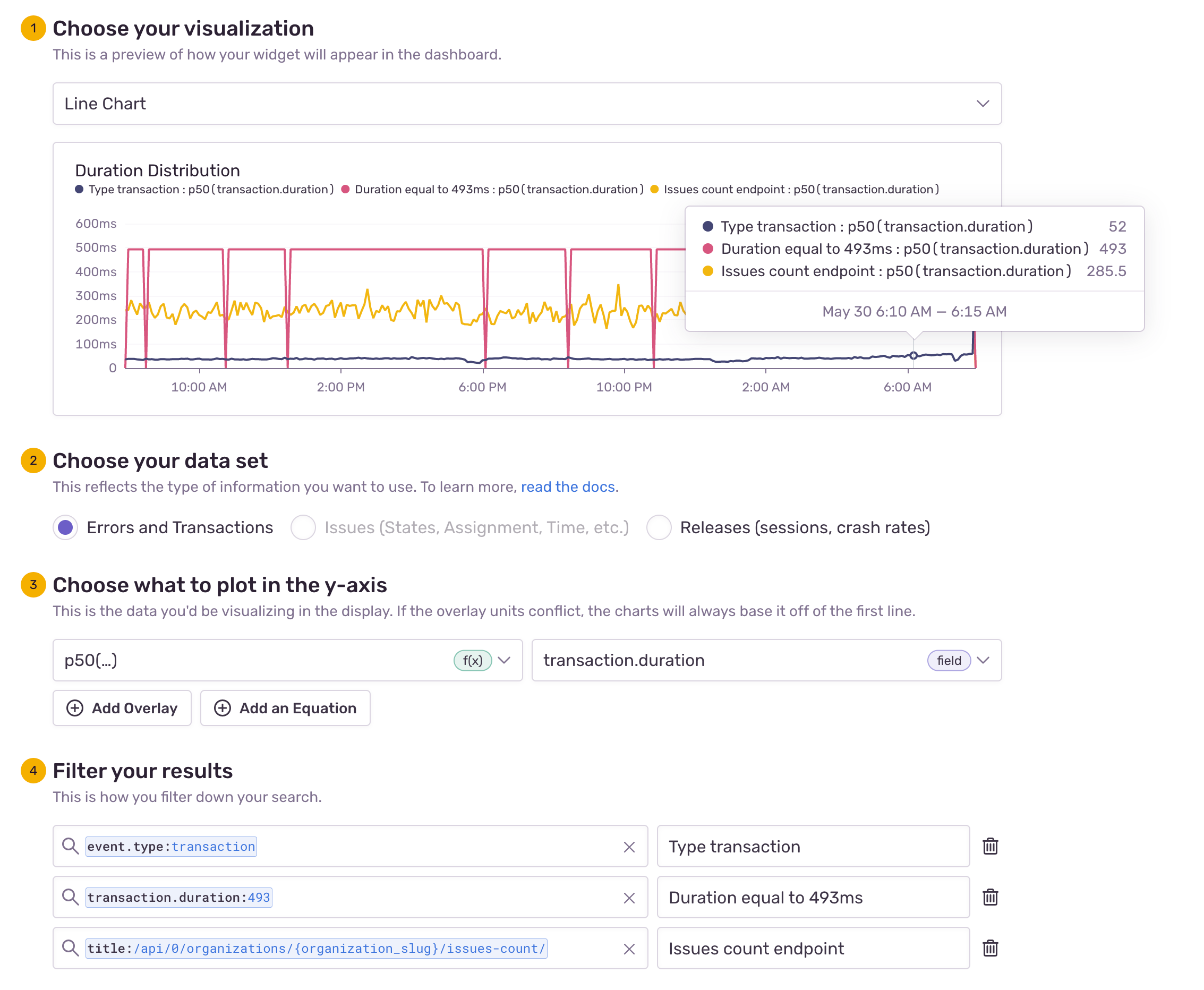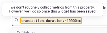 If you are building a widget with transaction data, and would like to use event-like filters (eg. transaction.duration:>100ms) or custom tags that you set on your transactions, we will routinely collect metrics to show you accurate counts and rates.