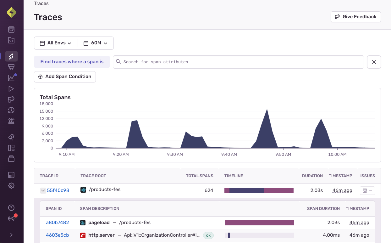 The Traces page allows you to query individual spans within traces and analyze distributed traces across your entire application stack. When you search by spans, your queries are more targeted and more precise. This helps you pinpoint specific operations that may be causing problems (like slow database queries, API calls, and so on) across multiple traces.