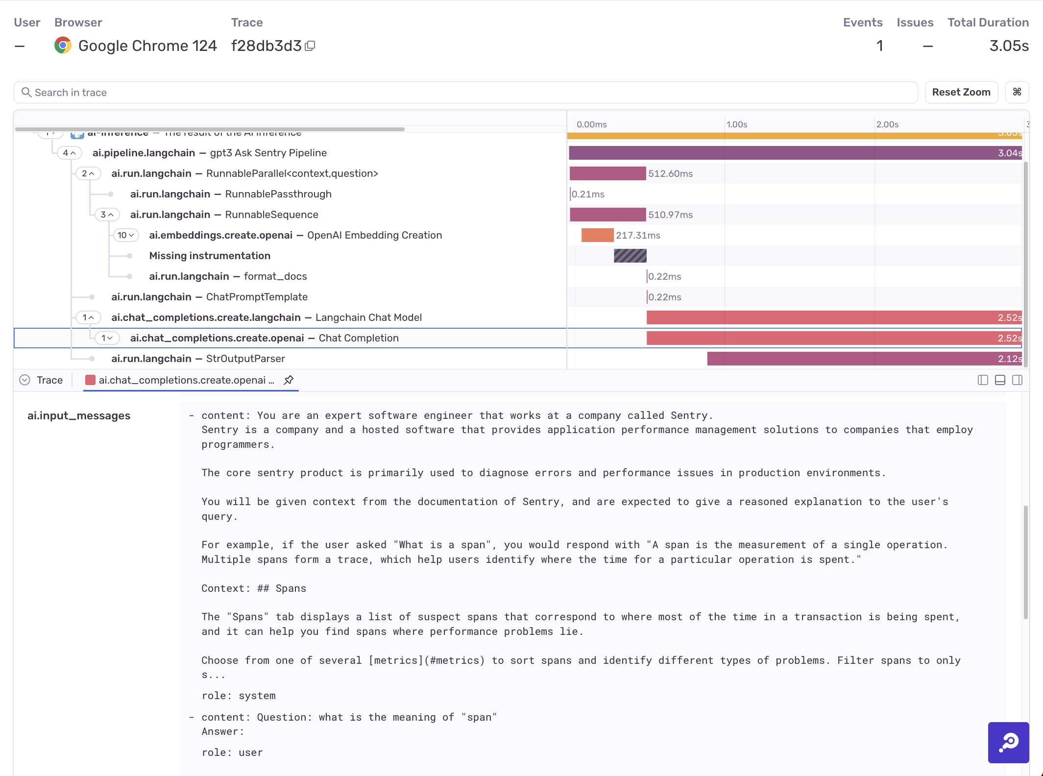 If configured to include PII, the Sentry SDK will add prompts and responses to LLMs and other AI models to spans in the trace view.