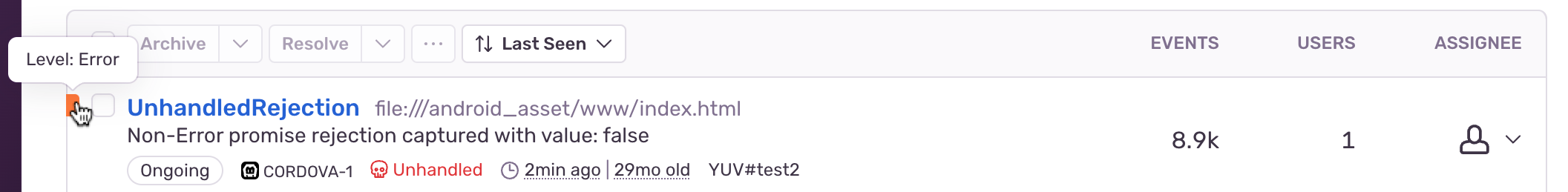 For error issues, to see the stack trace of the latest event, you can hover over the issue title. You can also hover over the colored square to the left of the issue information to see the error level (error, info, fatal, warning, debug, or sample) of the latest event: