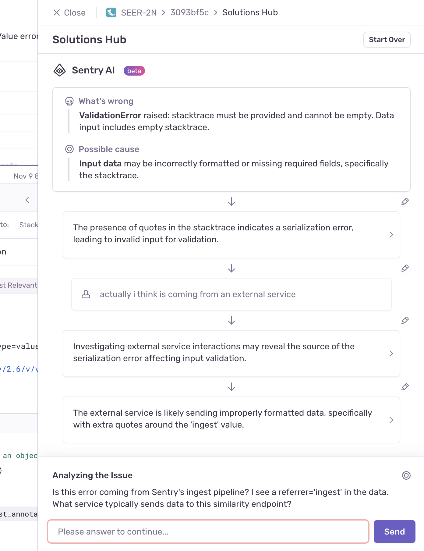 Since Autofix doesn’t have all the context, collaboration leads to the best results. You can step in at any time to add context or feedback. To edit its reasoning, click the "Edit" button above any line to provide instructions or corrections, and Autofix will adjust its approach accordingly. If Autofix encounters gaps in its understanding, it will ask for your input.