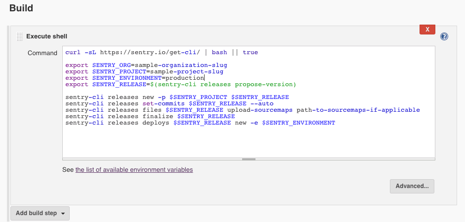 Copiedcurl -sL https://sentry.io/get-cli/ | bash || true export SENTRY_ORG=sample-organization-slug export SENTRY_PROJECT=sample-project-slug export SENTRY_ENVIRONMENT=production export SENTRY_RELEASE=$(sentry-cli releases propose-version) sentry-cli releases new -p $SENTRY_PROJECT $SENTRY_RELEASE sentry-cli releases set-commits $SENTRY_RELEASE --auto sentry-cli sourcemaps upload --release $SENTRY_RELEASE path-to-sourcemaps-if-applicable sentry-cli releases finalize $SENTRY_RELEASE sentry-cli deploys new -e $SENTRY_ENVIRONMENTNotes: