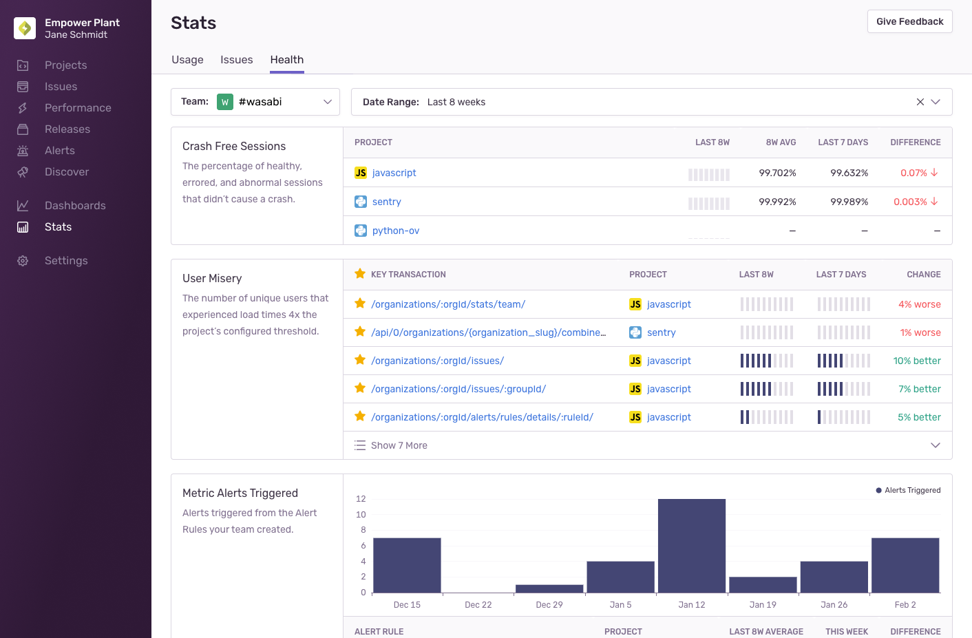 The "Health" tab shows information about the overall health of your projects; the crash free sessions, user misery of your team’s key transactions, the number of alerts triggered by your team’s alert rules, and the number of releases per project.